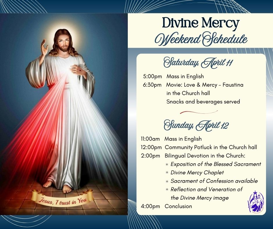 2:00pm to 4:00pm: Bilingual service in the Church: Exposition of the Blessed Sacrament, Divine Mercy Chaplet, Confession, Reflection and Veneration of the Divine Mercy image.