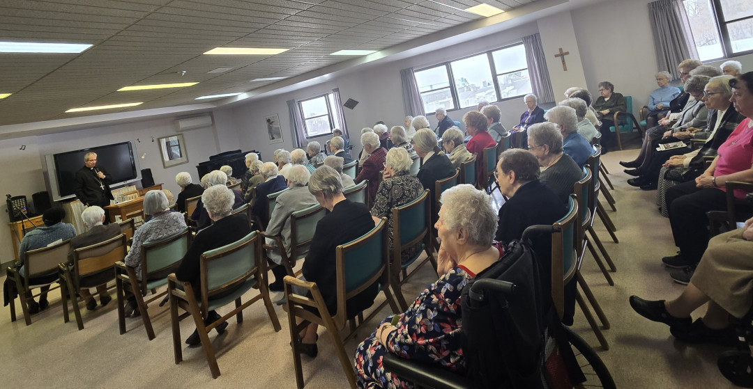 Le vendredi 6 février, Mgr Christian Lépine a visité la Résidence Bon-Secours à Notre-Dame-de-Grâce, accompagné des responsables de l’Office de la vie consacrée. Après avoir salué les sœurs à l’infirmerie et signé le livre d’or de la résidence, il a rencontré une soixantaine de religieuses pour partager des nouvelles encourageantes, notamment le retour discret mais réel de jeunes vers l’Église, qu’il a associé aux fruits des prières et des missions passées. La visite s’est poursuivie par une messe célébrée avec la communauté, suivie d’un repas festif au cours duquel l’archevêque a pris le temps de passer à chaque table pour échanger quelques mots avec les sœurs.