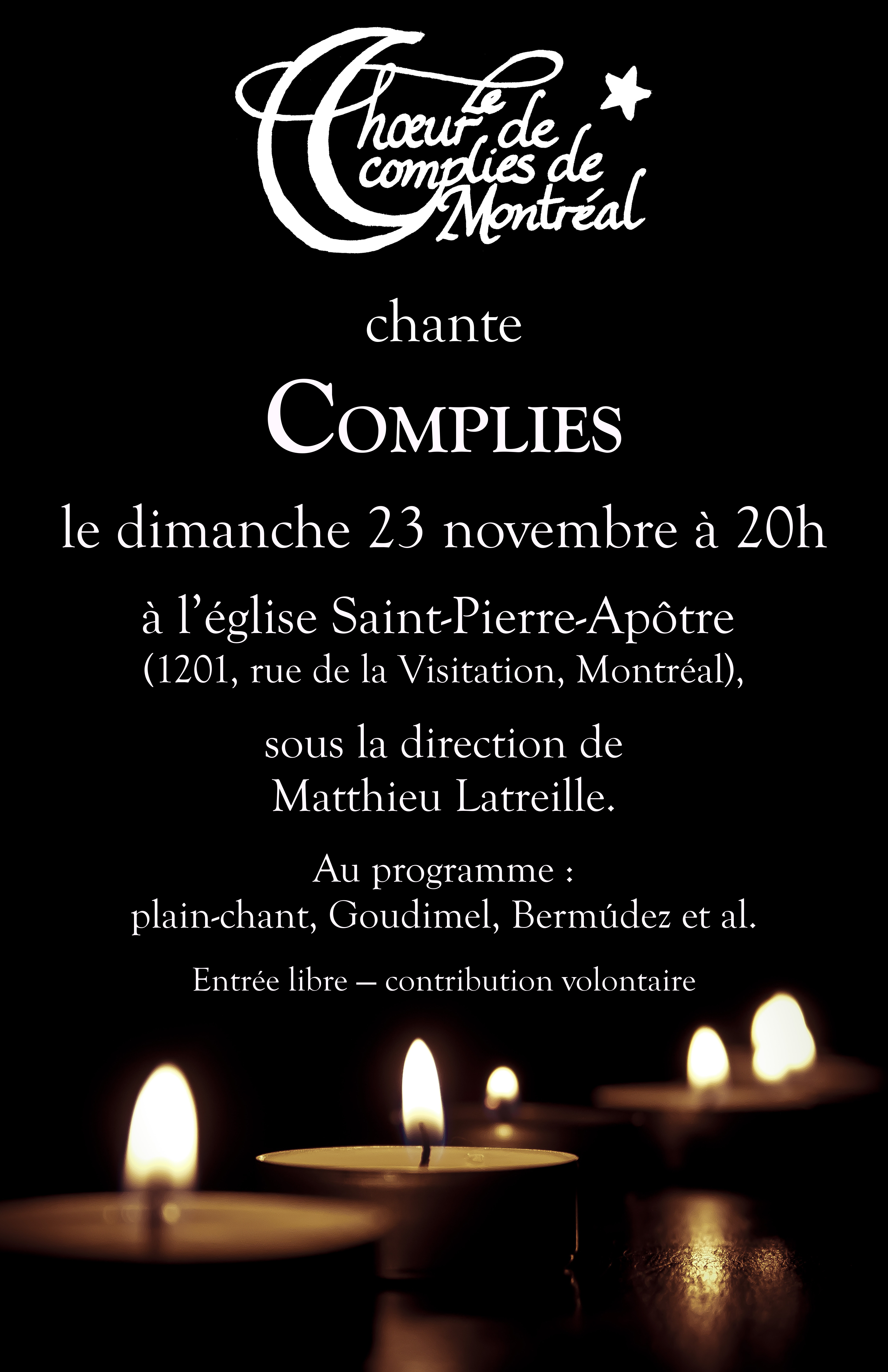 Vivez une expérience unique avec le Chœur de complies de Montréal le dimanche 23 novembre à 20h à l'église St-Pierre-Apôtre de Montréal. Vous y entendrez entre autres du plaint-chant, des motets du compositeur de la Renaissance Pedro Bermúdez, un psaume de Claude Goudimel ainsi que la première mondiale de « Les visions de la nuit » du compositeur Francisco Lequerica. Plongez-vous dans l'atmosphère de complies, le dernier office de la liturgie des Heures. Entrée libre, contributions volontaires.