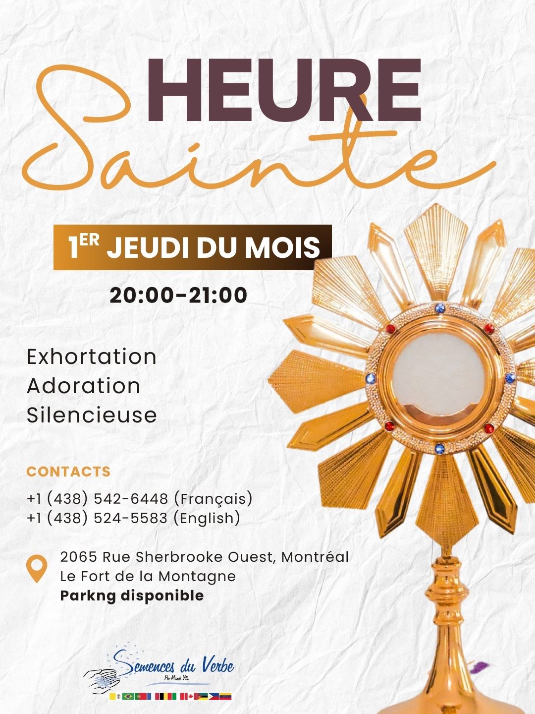 La Communauté Semences du Verbe vous invite les premiers jeudi du mois à vivre une heure de prière uni au Christ dans le début de sa Passion. Nous commencerons par une petite exhortation pour nous aider à méditer ce mystère, avant d'entrer dans le silence de l'adoration eucharistique, cœur à cœur avec notre Seigneur. C'est l'occasion de consoler le coeur de Jésus par notre amour, et d'unir à sa Passion toutes les souffrances de notre monde.