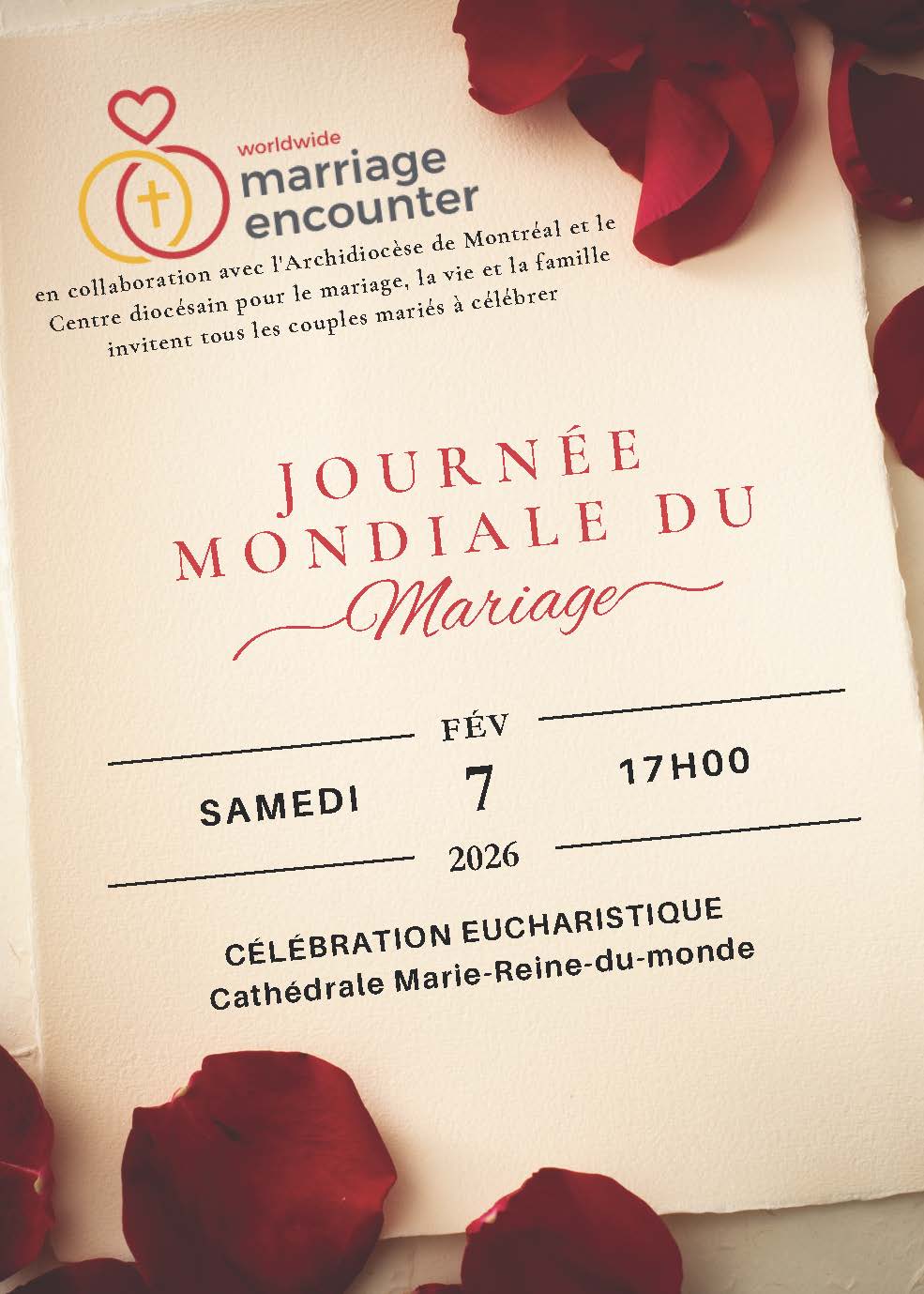 À l’occasion de la Journée mondiale du mariage, Worldwide Marriage Encounter et le Centre diocésain pour le mariage, la vie et la famille - vous invitent à une messe le samedi 7 février 2026.