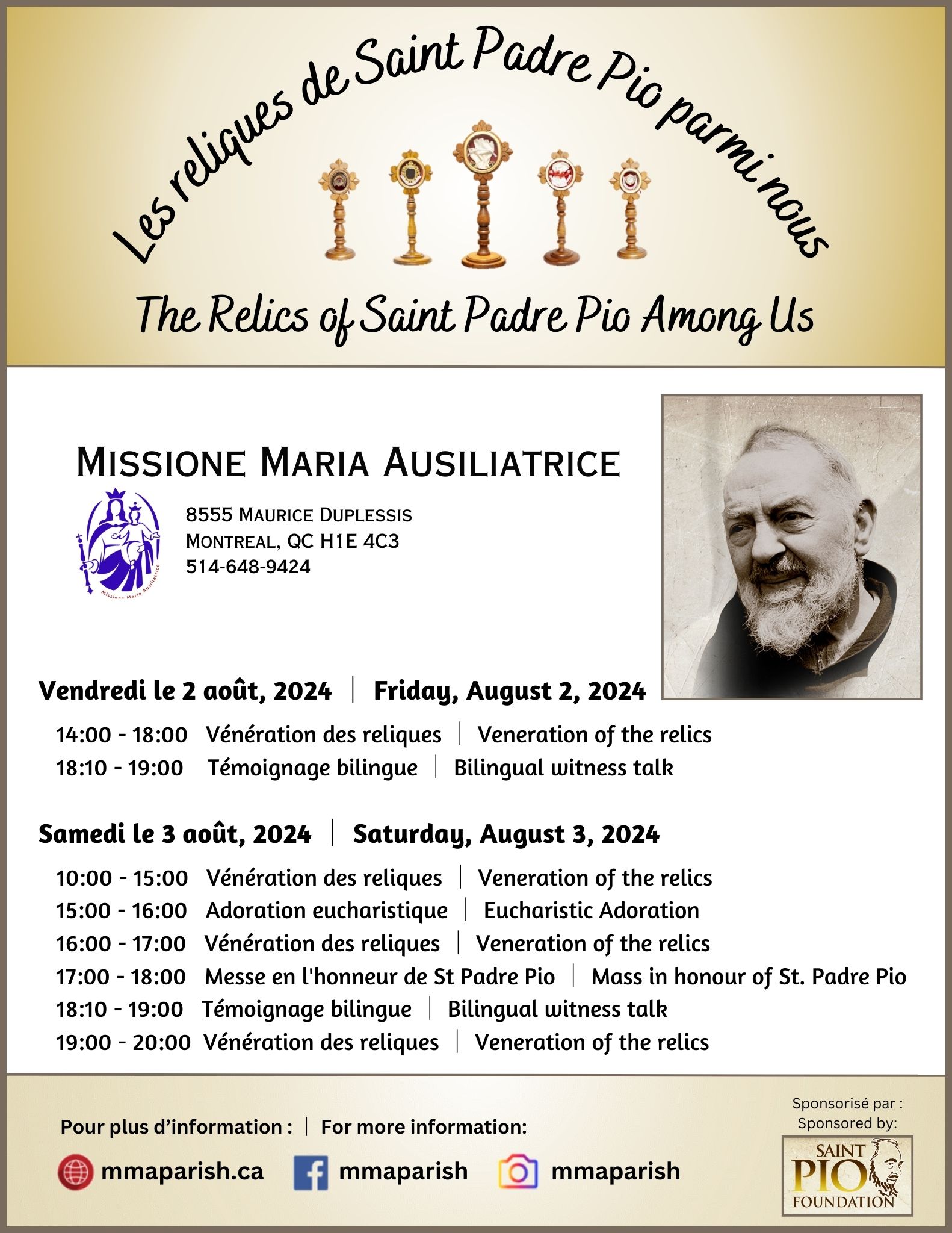 La Mission Marie Auxiliatrice accueillera et vénérera cinq reliques de St Padre Pio les 2 et 3 août 2024 ! Venez célébrer cet événement très spécial avec des vénérations, une Messe spéciale et une témoignage. │ Missione Maria Ausiliatrice will be hosting and venerating five relics of St. Padre Pio on August 2nd and 3rd, 2024! Come and celebrate this very special event with venerations, special Mass and a witness talk.