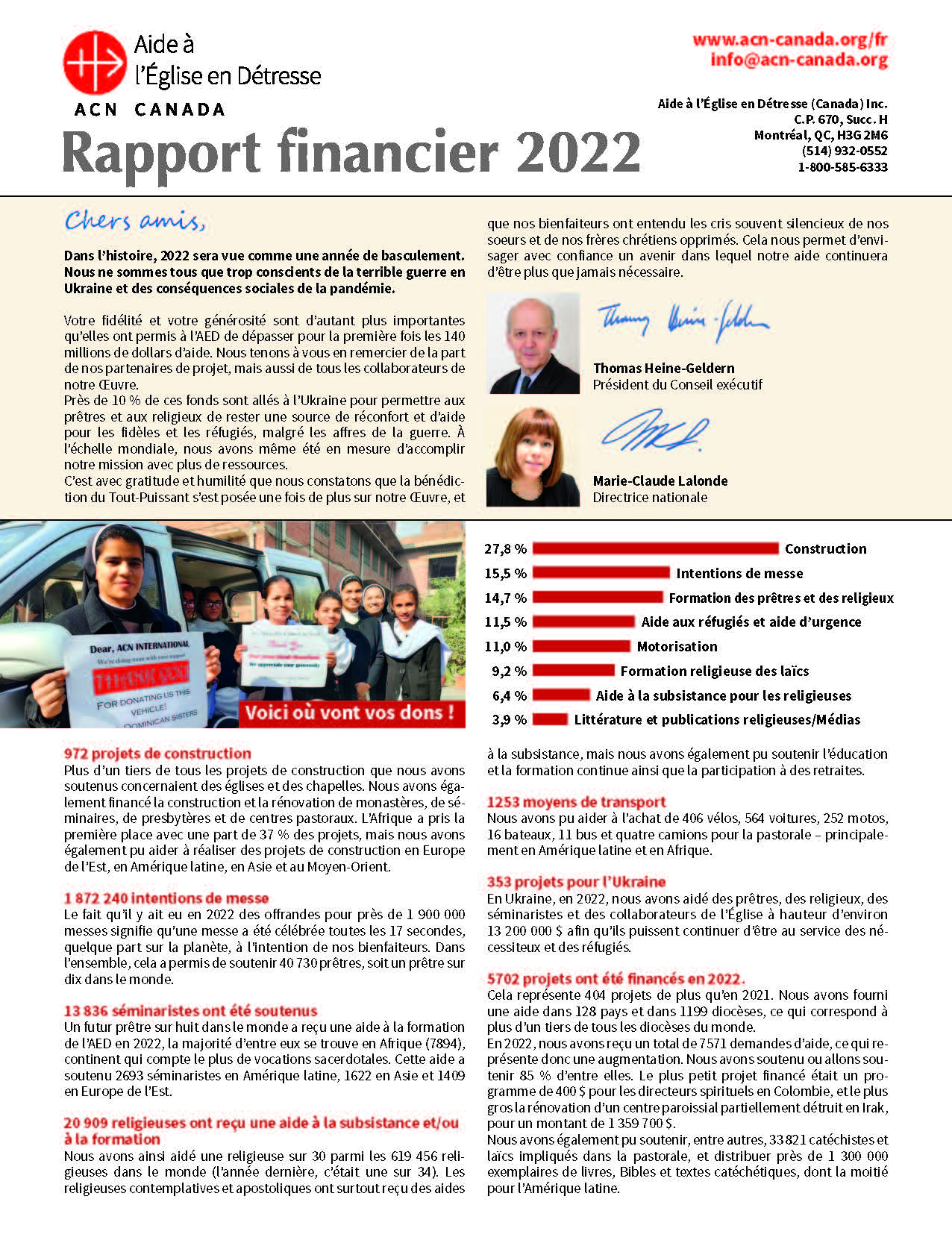 Montréal, 15 juin 2023 – L’œuvre pontificale Aide à l’Église en Détresse (AED) présente son rapport financier 2022, qui reflète une année de soutien record. L’Ukraine a été le plus grand bénéficiaire des aides en 2022, recevant presque 10 % des fonds, et l’Afrique a été la région qui a reçu le plus de soutien.