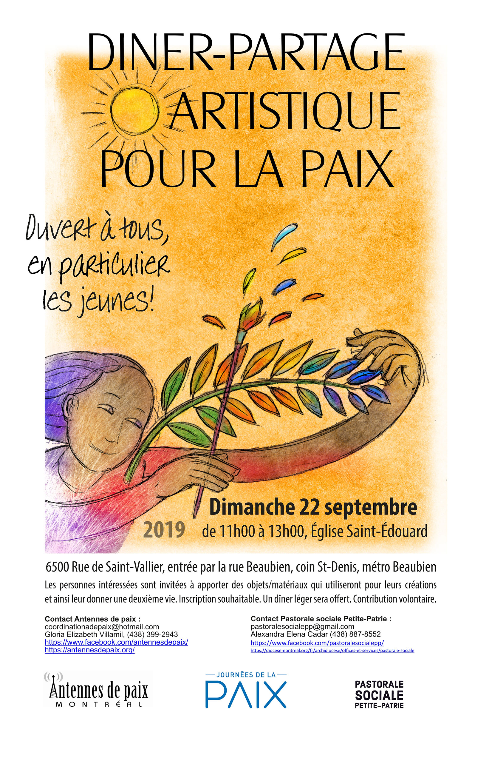 Activité de réflexion et de création artistique en lien avec la dimension écologique de la paix, dans une ambiance festive (dîner léger offert). Les participants-es seront amenés-es à créer des affiches qui pourront servir, par la suite, à la grande marche pour le climat, le 27 septembre à Montréal. Les personnes intéressées sont invitées à apporter des objets/matériaux qui utiliseront pour leurs créations et ainsi leur donner une 2e vie. Inscription souhaitable: pastoralesocialepp@gmail.com