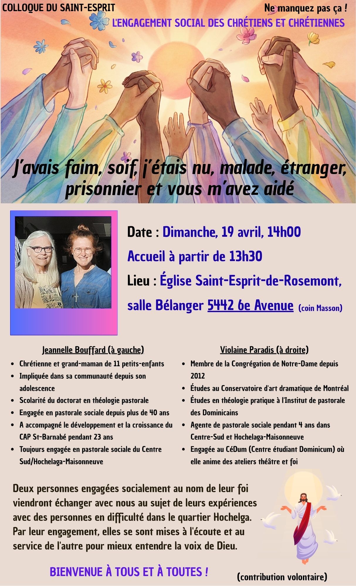 Deux personnes engagées socialement au nom de leur foi viendront échanger avec nous au sujet de leurs expériences avec les personnes en difficulté. Une invitation à se mettre à l'écoute et au service de l'autre pour mieux entendre la voix de Dieu.