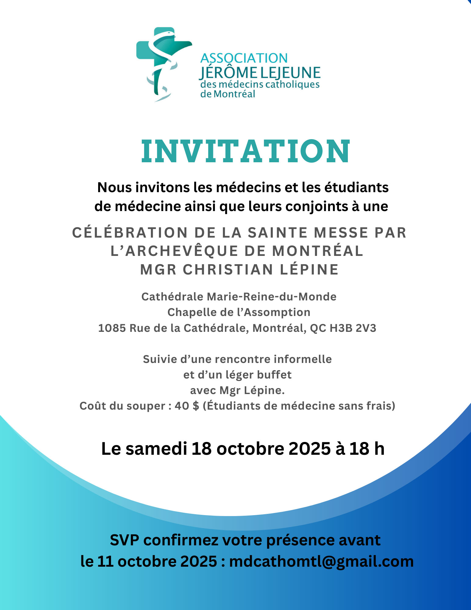 NOUS INVITONS LES MÉDECINS ET LES ÉTUDIANTS DE MÉDECINE AINSI QUE LEURS CONJOINTS, À UNE CÉLÉBRATION DE LA SAINTE MESSE PAR L’ARCHEVÊQUE DE MONTRÉAL