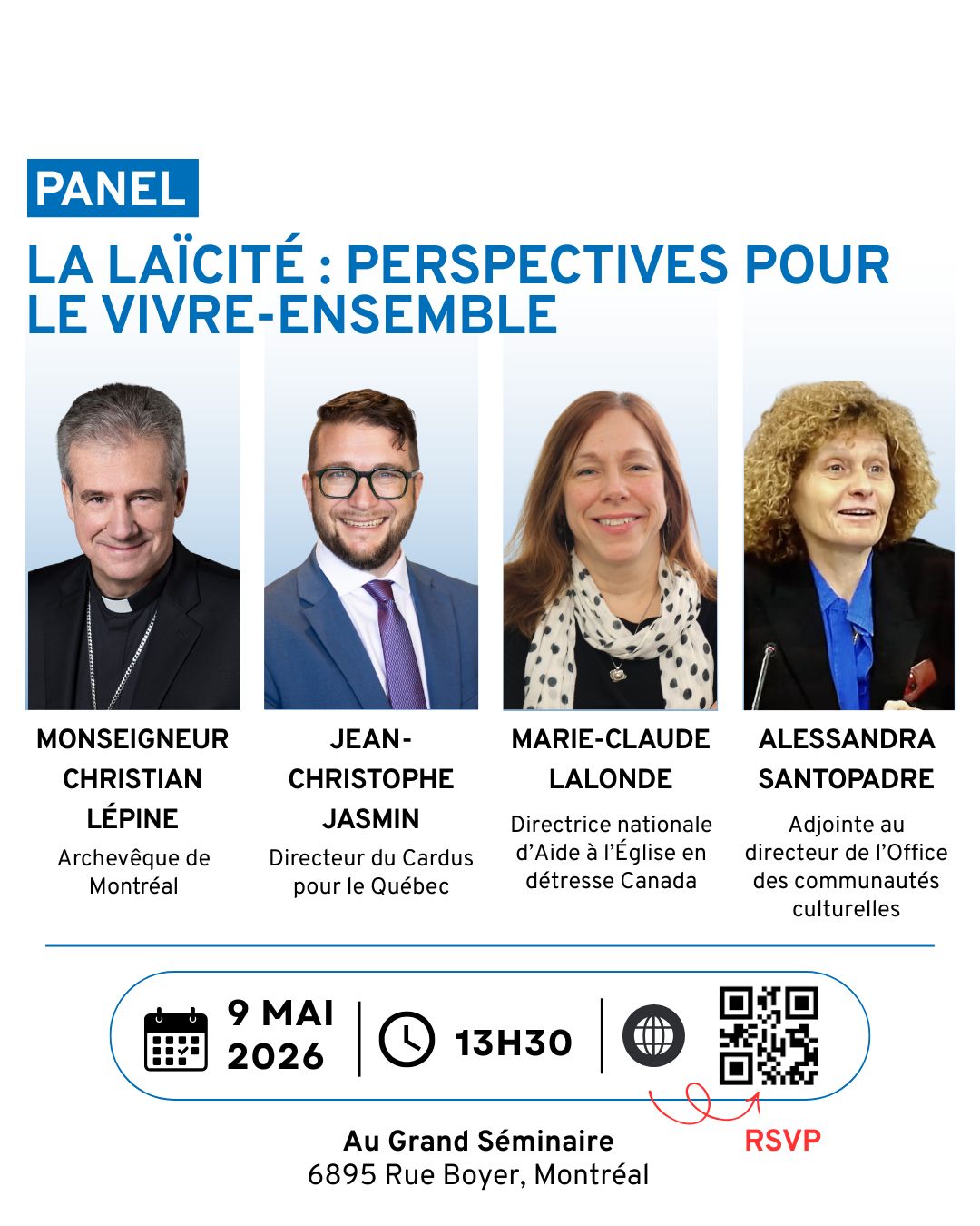 La Fondation du Grand Séminaire de Montréal vous invite à un panel le 9 mai sur « La laïcité au Québec : perspectives pour le vivre-ensemble ». Réunissant quatre experts, l’événement abordera les enjeux actuels et les impacts des changements législatifs. Un moment de dialogue pour réfléchir à la tolérance et au vivre-ensemble harmonieux dans la société québécoise.