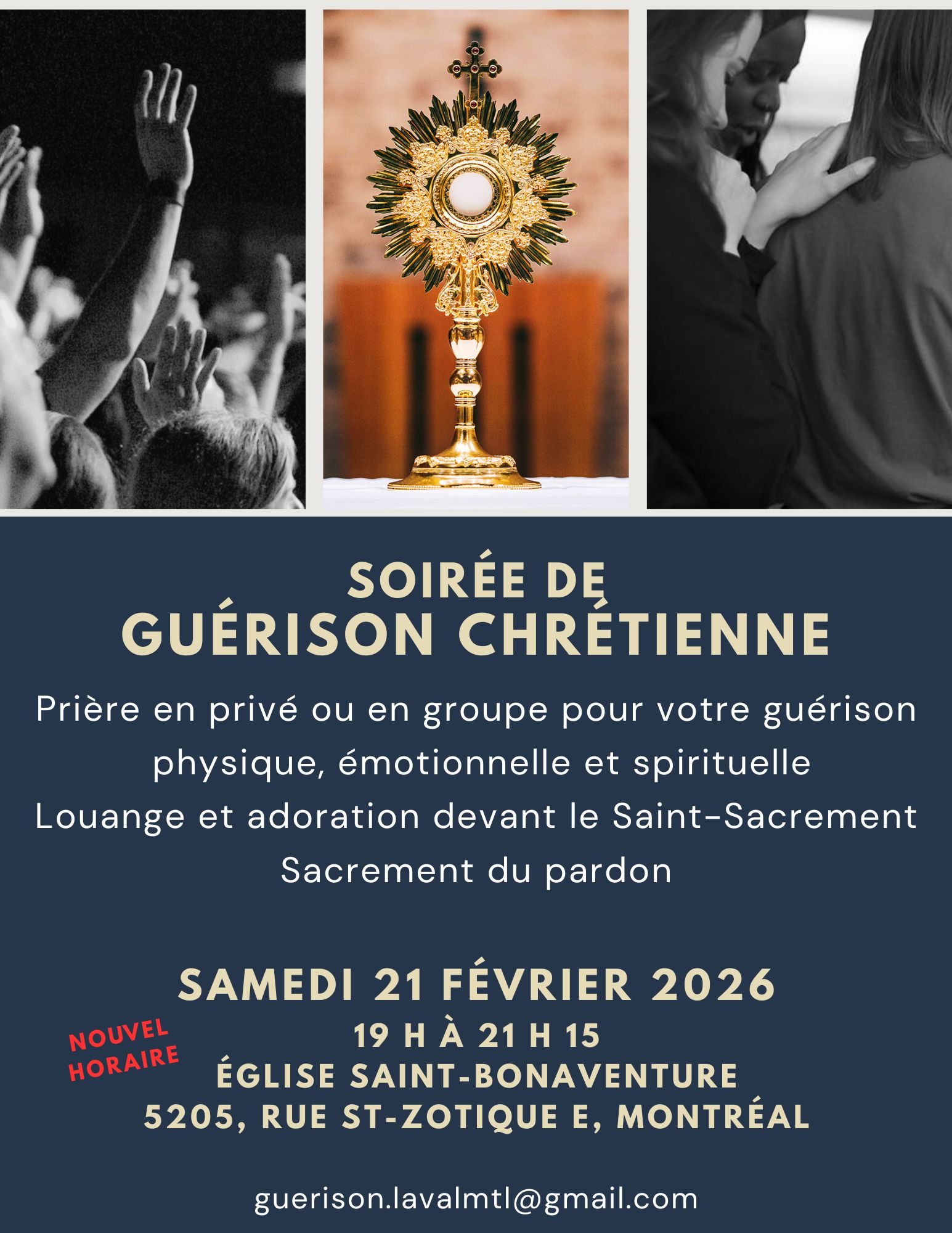 La soirée débutera par un temps de louange. Vous aurez ensuite la possibilité de recevoir, de façon individuelle ou en groupe, des prières pour votre guérison physique, émotionnelle, psychologique ou spirituelle.