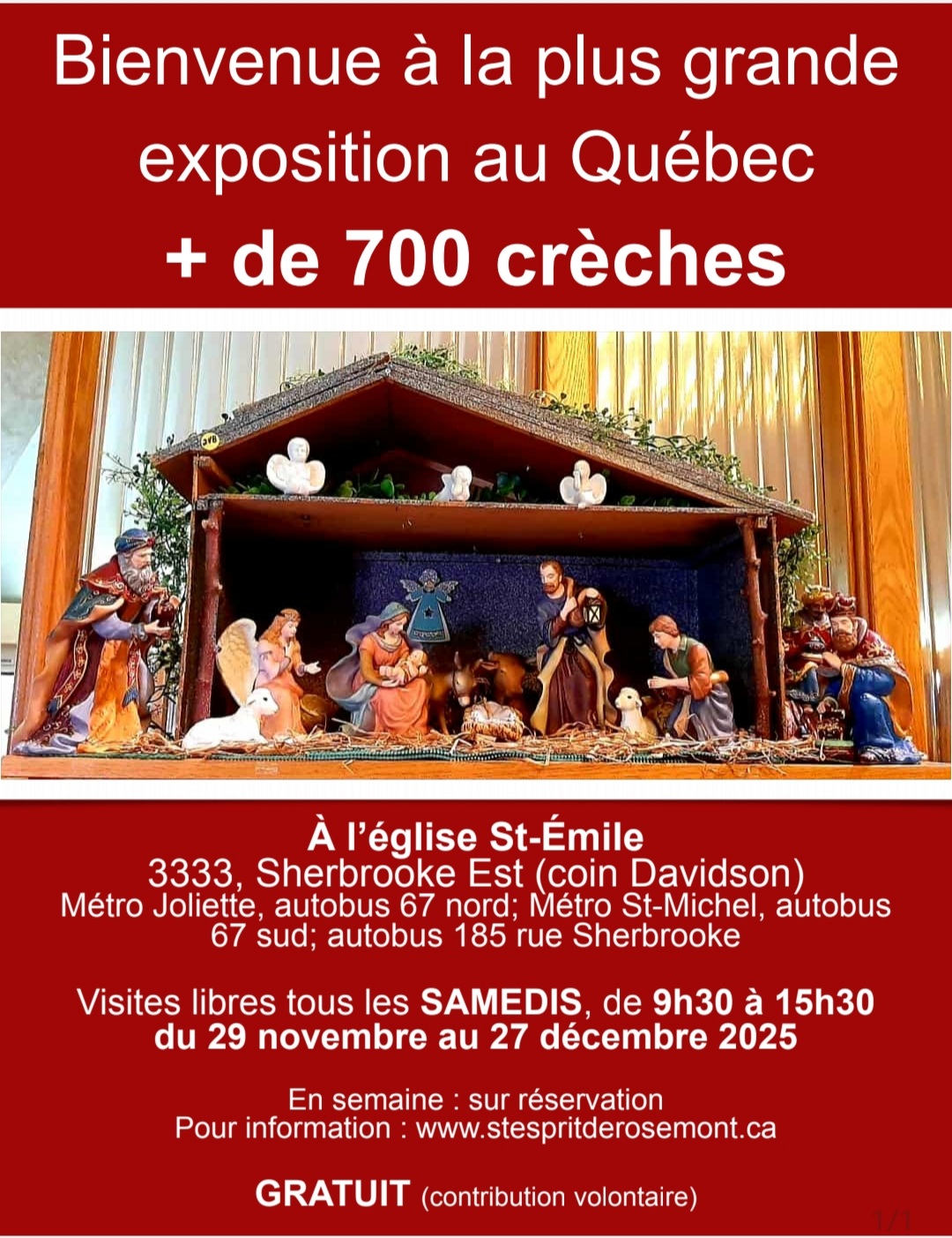 En attendant Noël, invitation à venir visiter la plus grande exposition de crèches sous un même toit au Québec! Les groupes-classes sur semaine sont bienvenus ainsi que les petits groupes organisés! Samedis, porte ouverte pour tous, grands et petits et c'est gratuit!